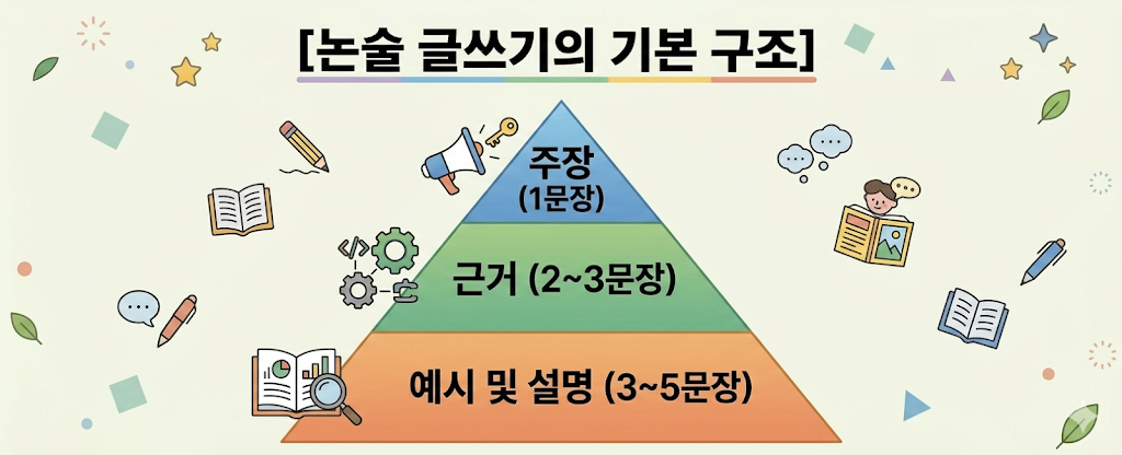 비판적 읽기가 익숙해지면 이제 자신의 생각을 글로 표현하는 단계입니다. 가장 중요한 원칙은 주장 + 근거 + 예시의 3단 구조를 습관화하는 것입니다.